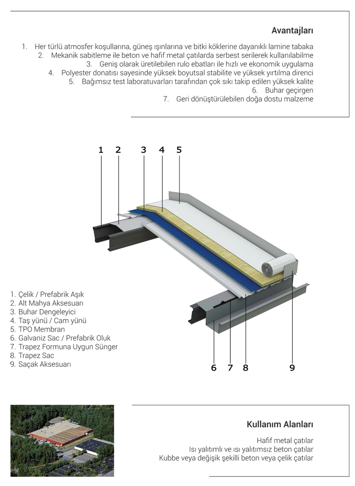 TPO, PVC ve EPDM membran sistemleri su yalıtımı amaçlı kullanılan tek kat sentetik membranlardır. Dış etkenlere, hava şartlarına dayanıklıdır. Yüksek UV dayanımına sahiptir. Bina hareketlerine ve genleşme