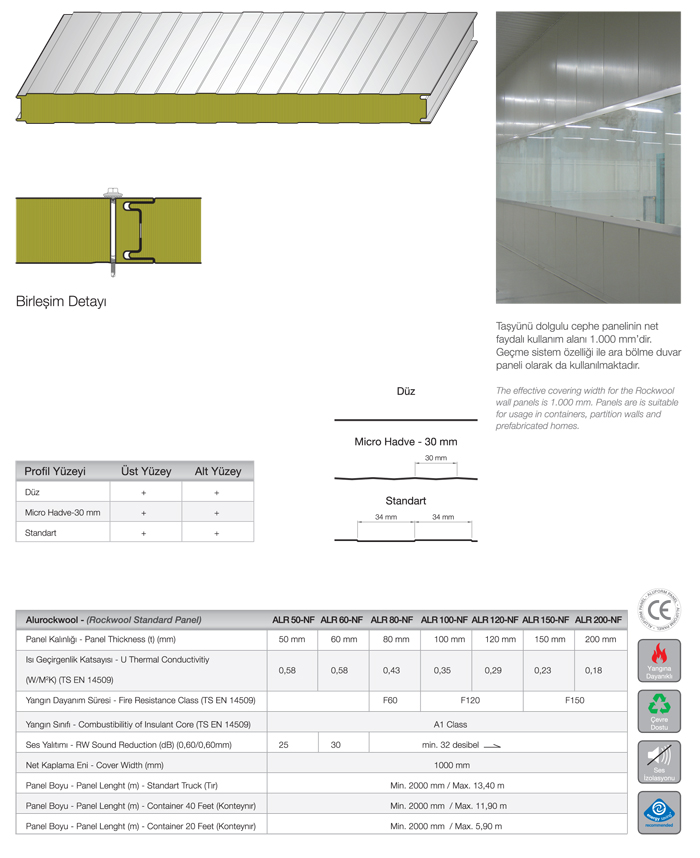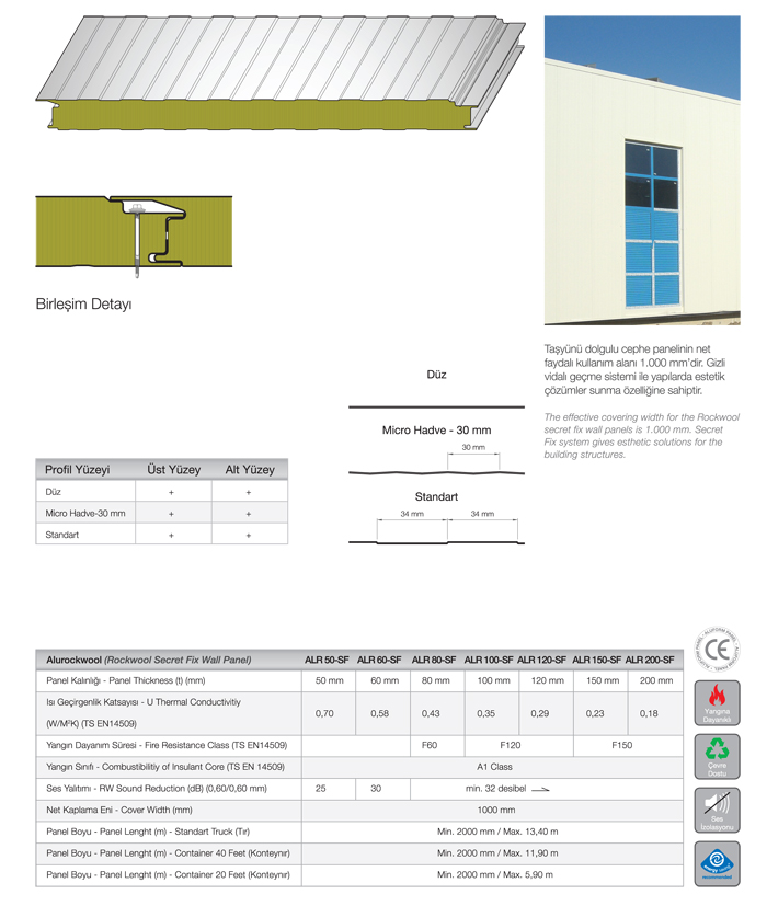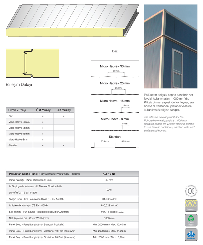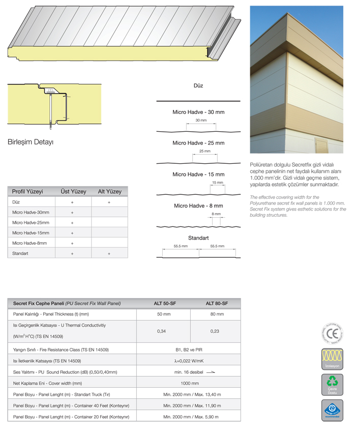 Poliüretan ve taşyünü dolgulu cephe panelleri gizli vidalı geçme sistemi ile yapılarda estetik çözümler sunar. Kilitsiz sistem ile konteyner, ara bölme duvarlarında, prefabrik evlerde kullanılma özelliğine sahiptir. Geçmesistem özelliği ile ara bölme duvar paneli olarak da kullanılmaktadır.MGİ, sandwich panelsistemleri ile cephede, projeyeve tekniğe uygun detay çözümleri sunmaktadır.