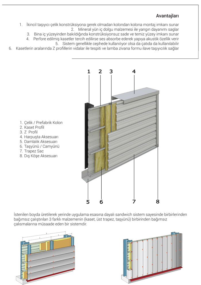 Özellikle endüstriyel yapılarda tercih edilen kaset sistemleri, ana konstrüksiyon haricinde ek bir taşıyıcıya ihtiyaç duyulmadığından ekonomiktir, statik açıdan bina yükünü hafifletir. Ekstra bir taşıyıcı konstrüksiyona ihtiyaç olmadığından dolayı iç mekanda düzgün, hijyenik, kolay temizlenebilir bir ortam yaratır.Kaset üzeri hem yatay hem de düşey döşenebilen trapezler ile estetik görünüm kazandırır.