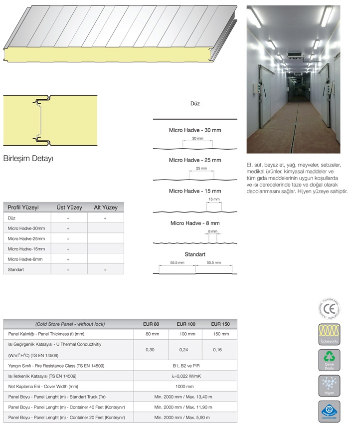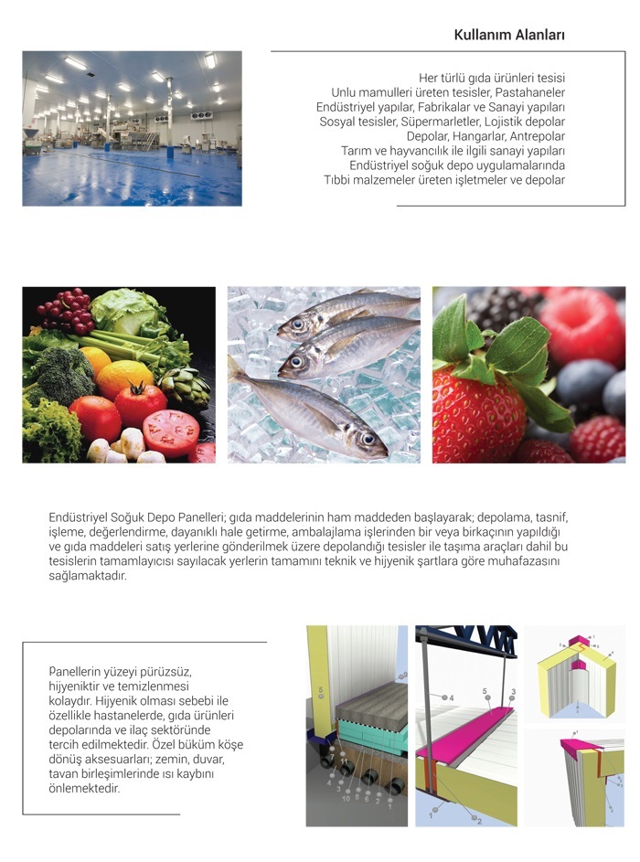 MGİ, yüksek ısı yalıtımı ve enerji tasarrufu sağlayan hijyenik panel ürünleri ve teknik donanımıyla; et, süt, beyaz et, yağ, meyveler, sebzeler, medikal ürünler, kimyasal maddeler ve tüm gıda maddelerinin uygun koşullarda ve ısı derecelerinde taze ve doğal olarak depolanmasına uygun olarak soğuk depolama alanları projelendirerek, uygulamasını yapmaktadır.MGİ, isteğiniz doğrultusunda istenilen ısı derecelerde soğuk hava depo sistemleri projelendirerek tüm kurulum hizmetlerini vermektedir.