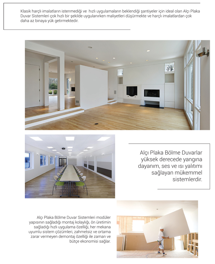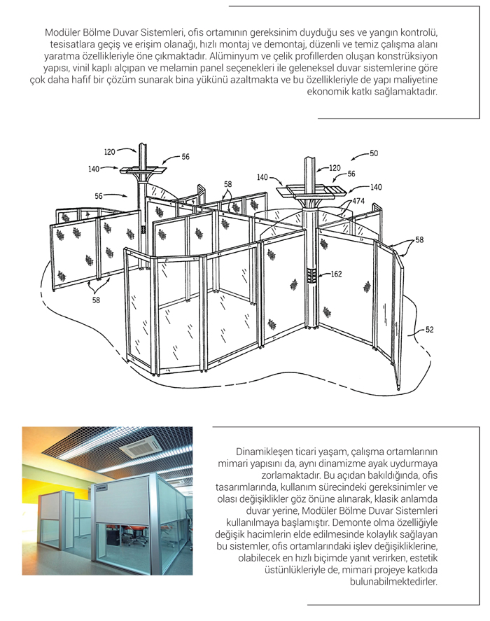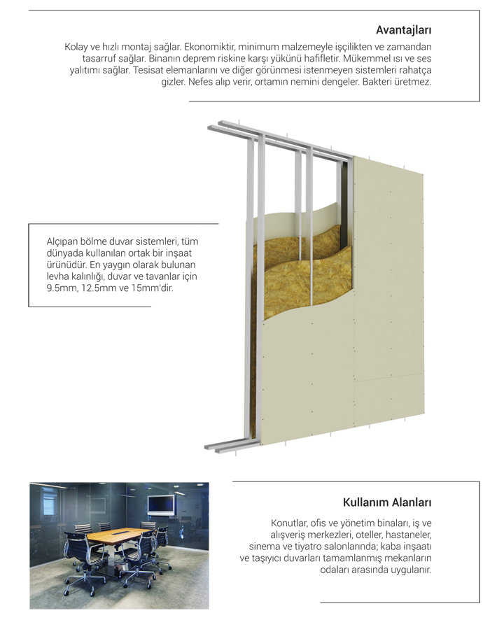 Alçıpan, cam ve aluminyum başta olmak üzere farklı malzeme ve tekniklerle uygulanan hafif, estetik, esnek ve istenilen yalıtım özelliklerine sahip bölme duvar sistemleri, demontable olup, montaj kolaylığı ve her ortama rahatça ölçeklendirilebilir olması bakımından tercih edilmektedir. Oda duvarları, tesisat duvarları, WC ve banyo bölmeleri elde edilebilen bölme duvarlar, düzgün ve estetik bir görünüm sağlar.Ofis tasarımlarında, kullanım sürecindeki gereksinimler ve olası değişiklikler göz önüne alınarak, klasik anlamda duvar yerine, modüler bölme duvar sistemleri kullanılmaya başlamıştır.