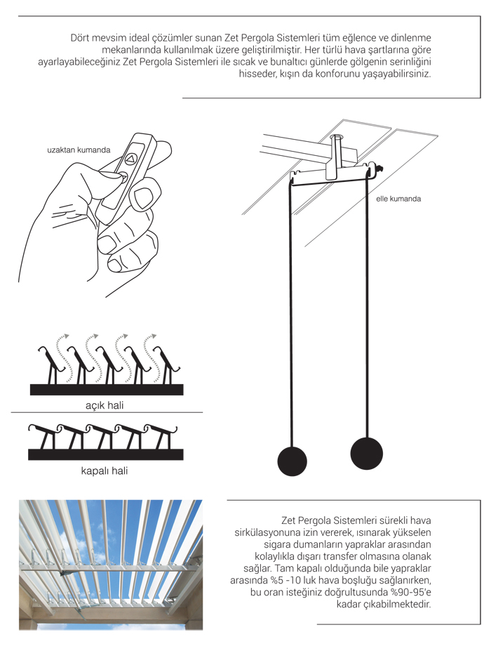 Üstü açık mekanlar için ideal çözüm olan açılır-kapanır pergola sistemleri kolay kullanımıyla dört mevsim hizmet verir. Su sızdırmaz, havuzlanma yapmaz. Güneş ısısını muhafaza etmesi, bitişik odalara siküle etmesi gibi özelliklerinden dolayı mekanın ısı dengesini mükemmel bir biçimde sağlar. Ses yalıtımına da yardımcı olur.Açılır - kapanır pergola ile terasınızda yada verandanızda daha fazla güneş yada daha fazla gölge olması artık sizin kontrolünüzde!