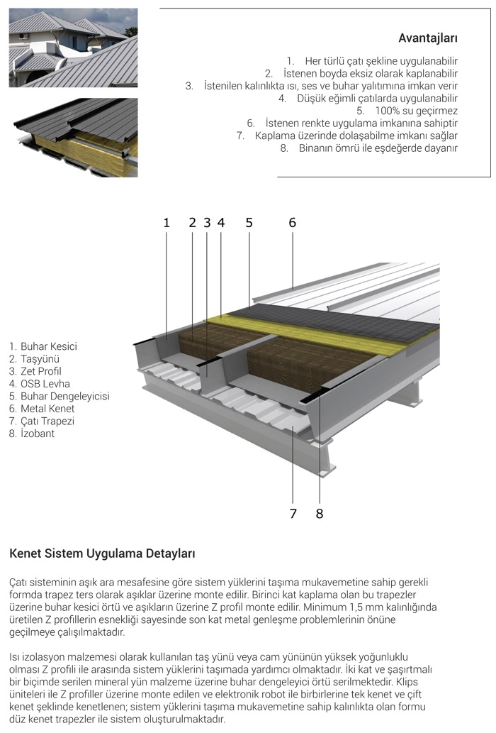 Her türlü çatı, cephe kaplamalarında kullanılabilen kenet sistem trapez formları, yapıların sistem yüklerine ve estetik görüntülerine uygun şekilde ayrıca yapı maliyetleri düşünülerek dizayn edilmişlerdir. En kesitinde her hangi bir hadvesi olmayan iz çizgilerine sahip kenet trapezlerin kaplama eni ölçüleri 325 – 525 mm arasında değişir.