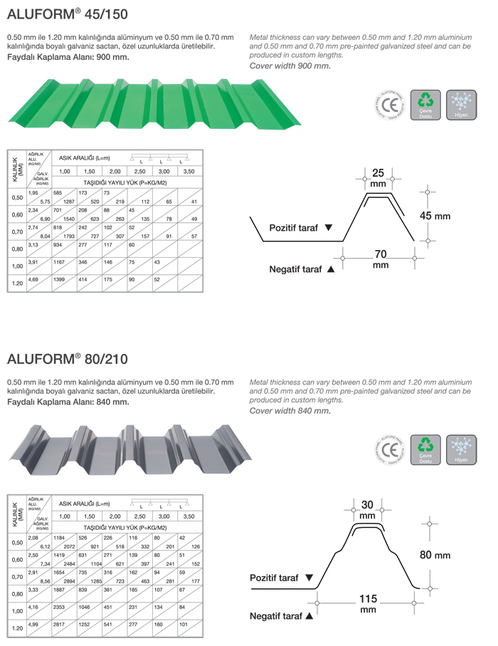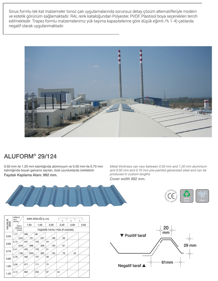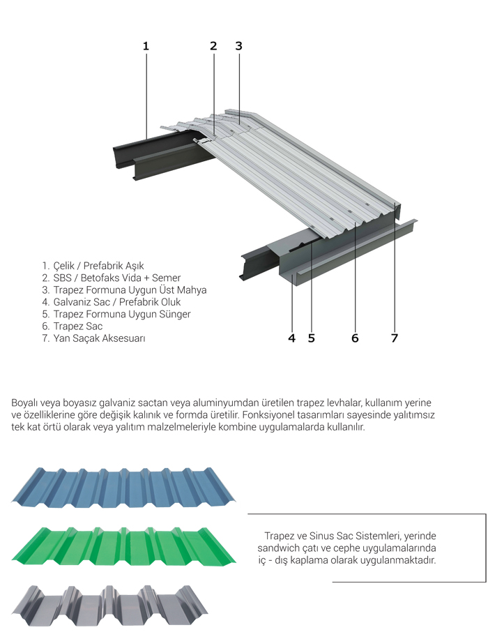 Yalıtımsız tek kat trapez ve sinus formlu malzemeler; endüstriyel tesislerde, depo inşaatlarında, şantiye çevresi korumalarında ve sanayi yapılarında, yedi farklı çeşidi ile çatı ve cephe paneli olarak ekonomik çözümler için ideal bir malzemedir. Radüslü form verebilme özelliği sayesine estetik detay çözümleri uygulamak mümkündür.